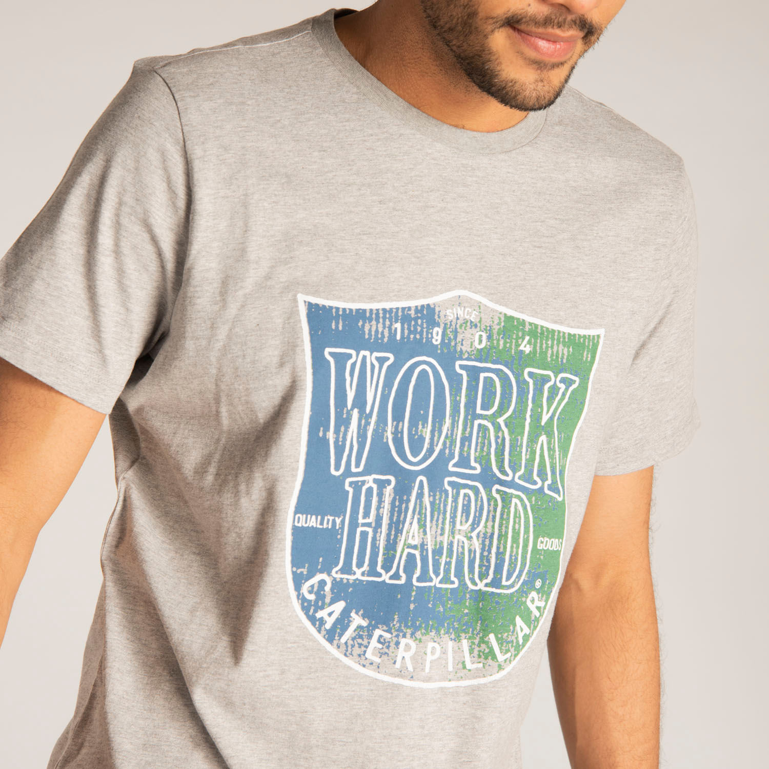 • Short Sleeve T-Shirt Men Work Hard Badge Tee with logo at the bottom. 88% cotton/12% polyester.