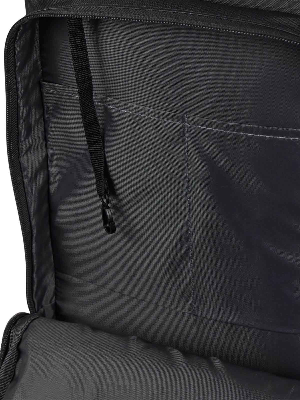 - Front pocket with zipper and organizer panel with slots for pens and a cord to hold keys