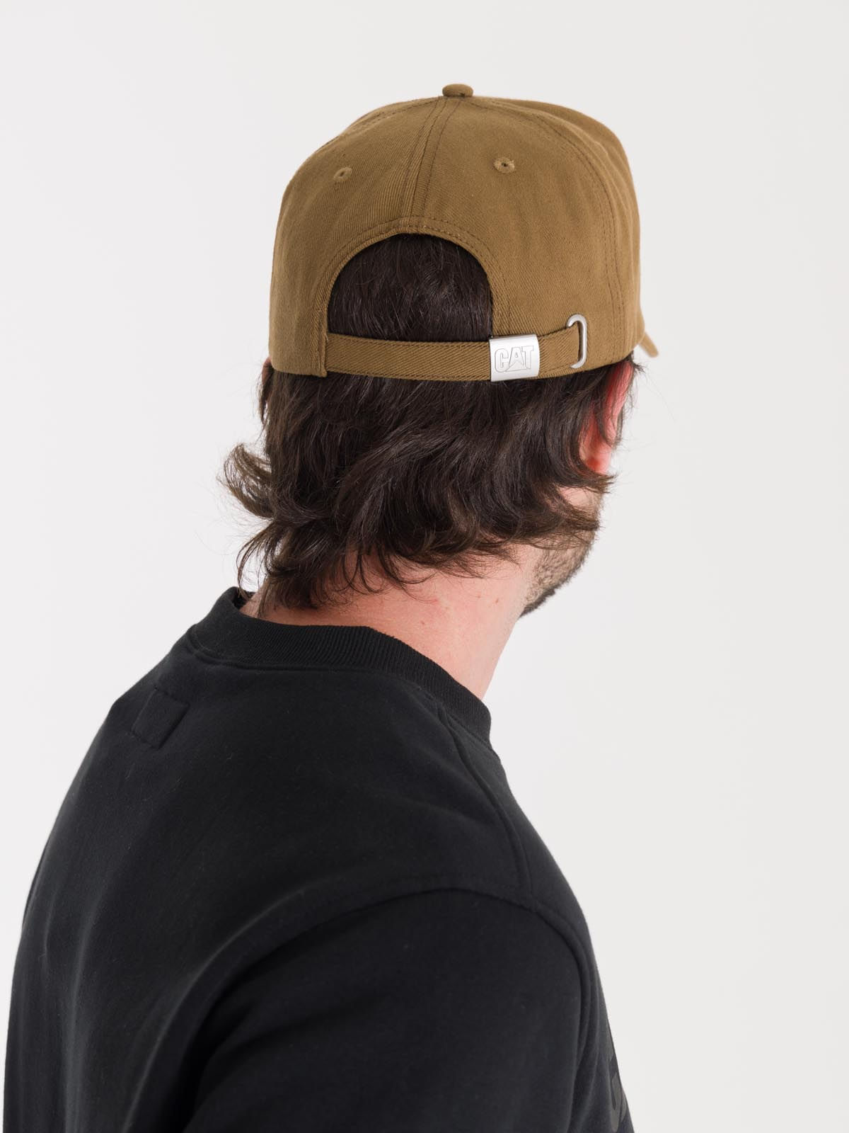 - Back strap made of self-fabric with metal closure featuring the Caterpillar logo and eyelet