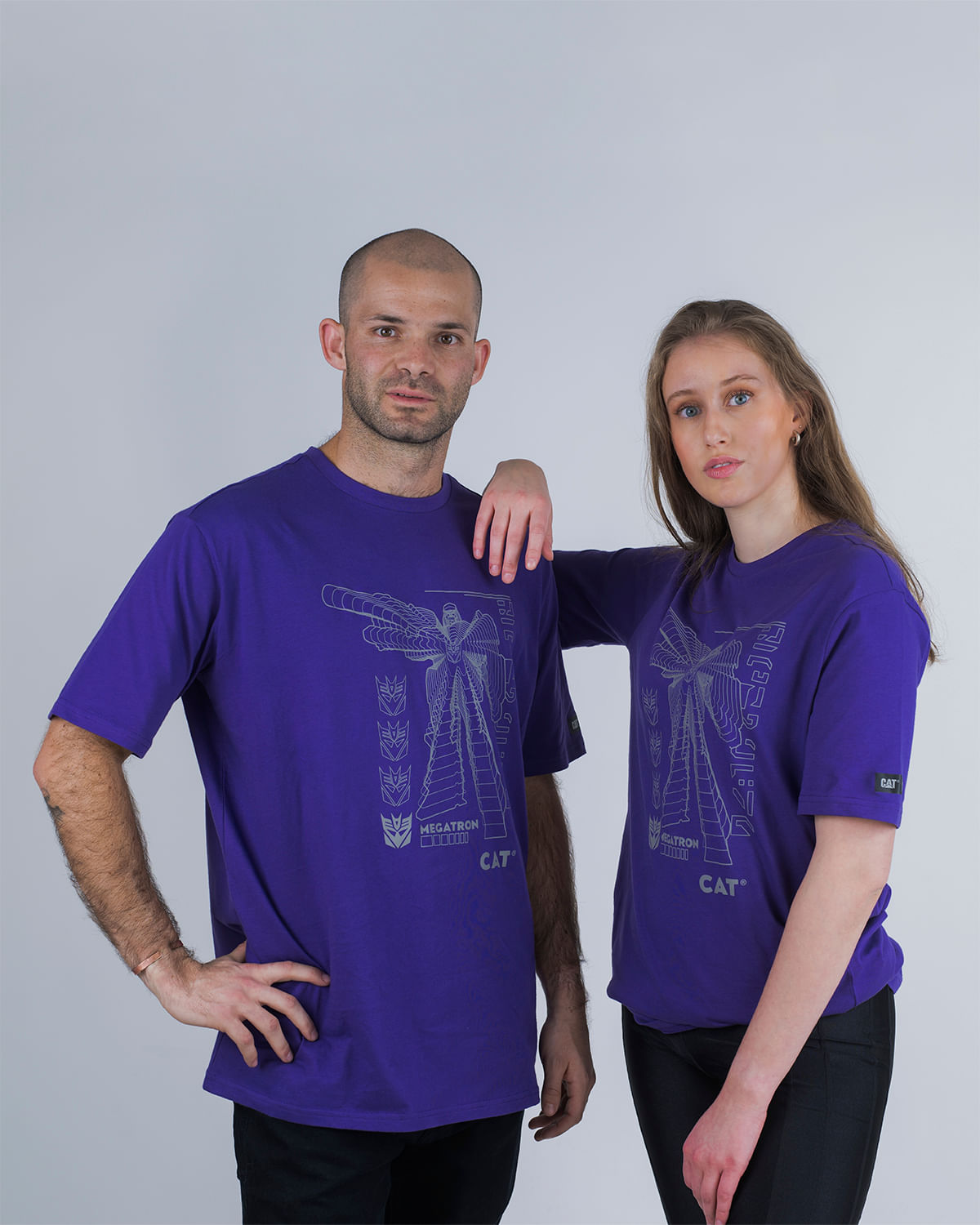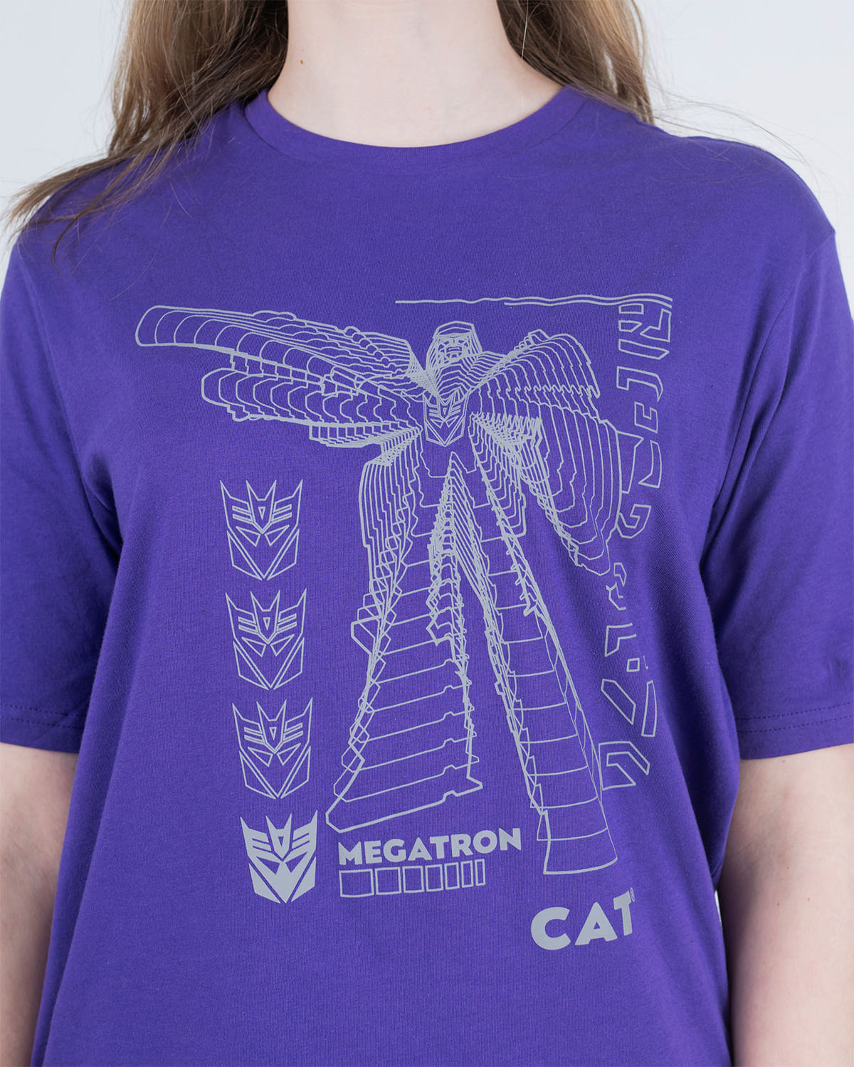 Unleash your inner Megatron with the Transformers Megatron t-shirt. This dynamic shirt features a powerful graphic printed on the chest, showcasing the iconic character in person. With the CAT logo and the Transformers logo printed on the sleeve, this t-shirt is the perfect choice to stand out.