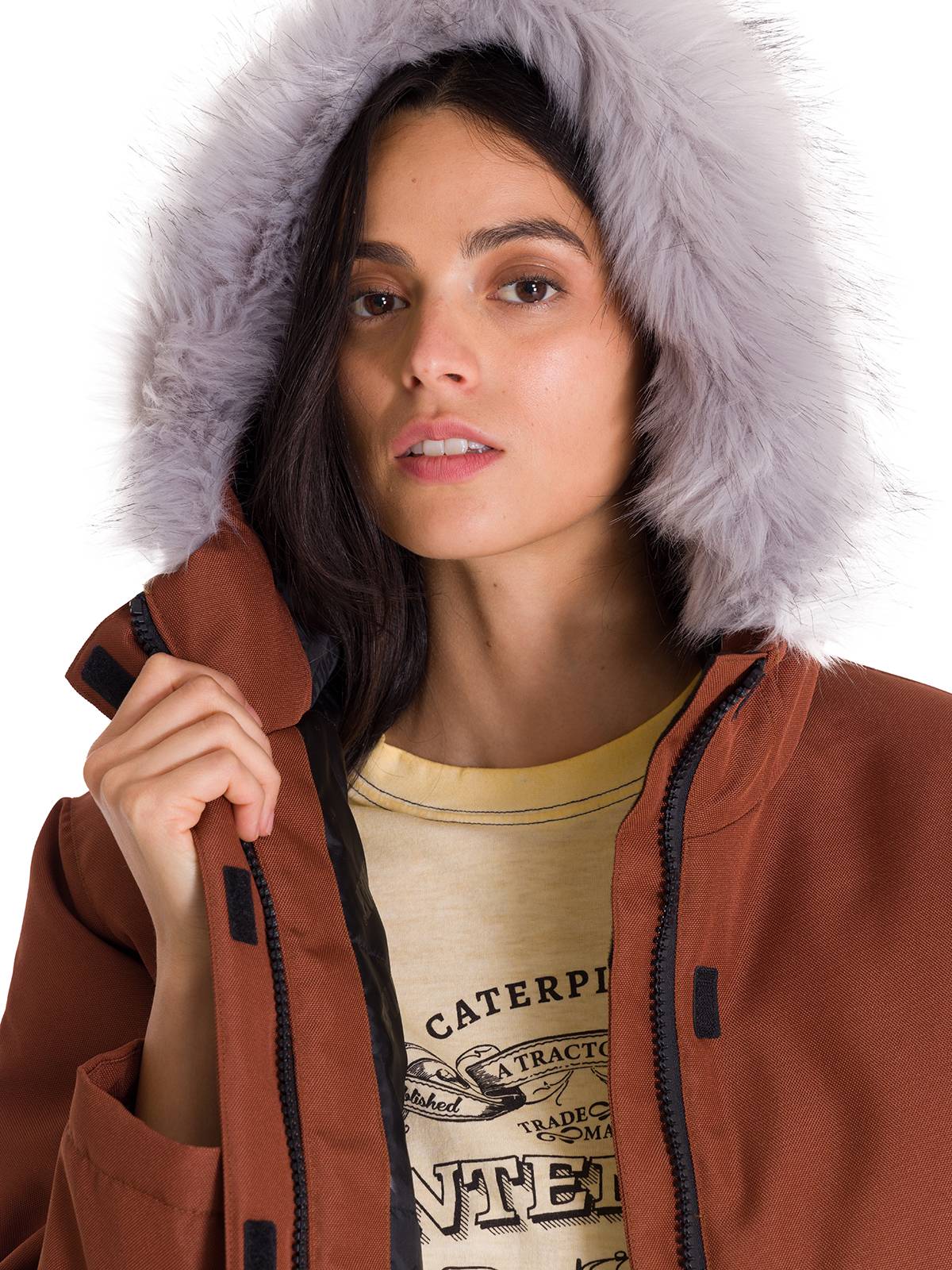 - Faux fur ruffle on the hood opening
