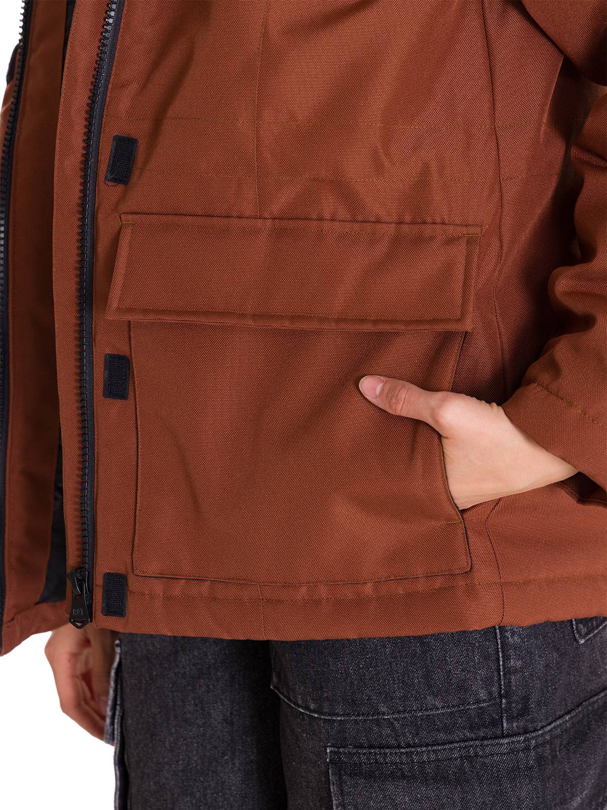 - Central front zipper with velcro closure on the storm flap